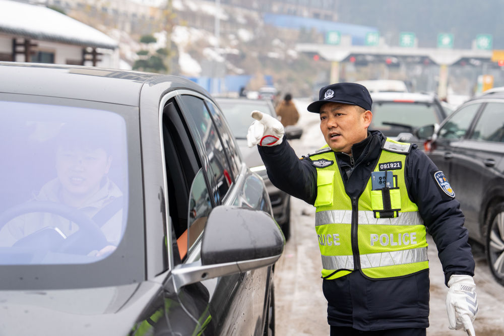 在湖南長(zhǎng)張高速慈利東收費(fèi)站附近,交警解答旅客的提問(2月6日攝)。新華社記者 陳思汗 攝