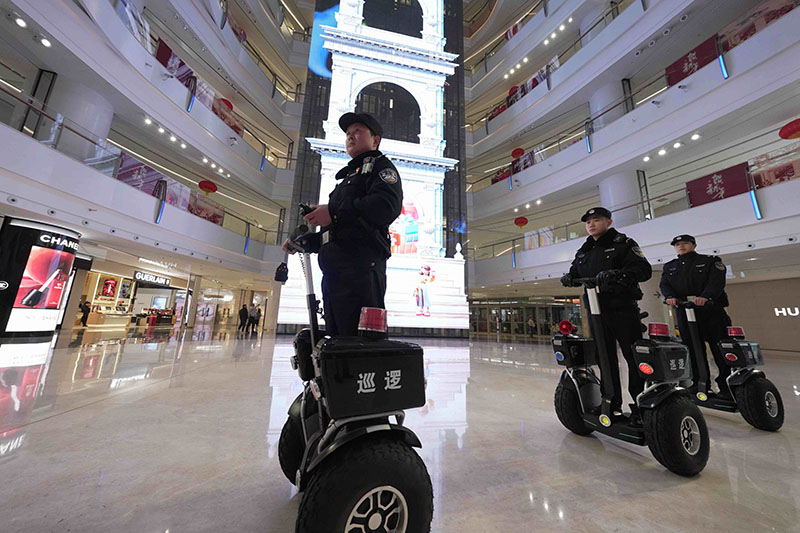 圖為湖北省武漢市公安局武昌區(qū)分局梅苑派出所民警駕駛平衡車在武商夢(mèng)時(shí)代廣場(chǎng)內(nèi)部巡邏。孫遜/攝