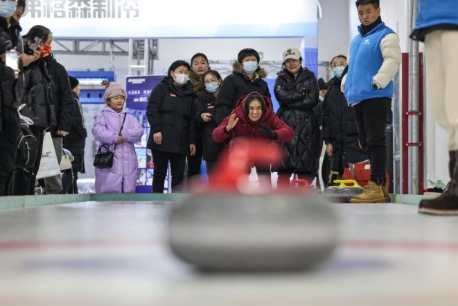2023年12月16日,市民在首屆呼倫貝爾·海拉爾冰雪產(chǎn)品冬季展銷會上體驗冰壺。新華社記者 王楷焱 攝