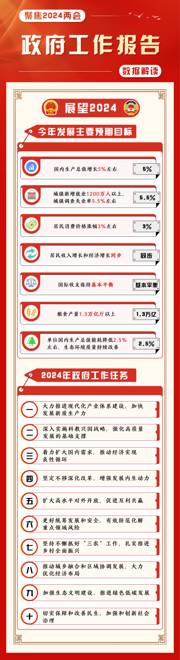 (制作:法治網(wǎng)輿情中心 數(shù)據(jù)來源:新華社微博:《一圖速覽2024年政府工作報告》;中國新聞網(wǎng):《事關你我!30句話讀懂政府工作報告》)
