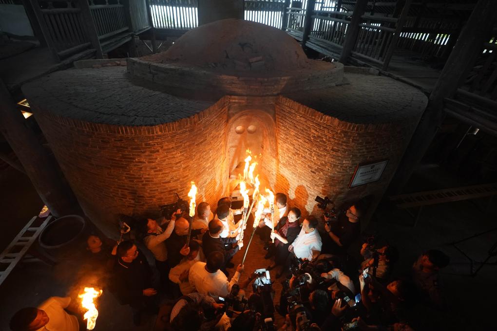 2023年10月19日,嘉賓與把樁師傅一起對(duì)葫蘆窯進(jìn)行復(fù)燒點(diǎn)火。當(dāng)日,作為2023中國(guó)景德鎮(zhèn)國(guó)際陶瓷博覽會(huì)的活動(dòng)之一,景德鎮(zhèn)古窯民俗博覽區(qū)對(duì)重建的明代葫蘆窯進(jìn)行點(diǎn)火復(fù)燒。同時(shí),景德鎮(zhèn)歷代瓷窯活態(tài)傳承紀(jì)實(shí)館開館。新華社記者 周密 攝