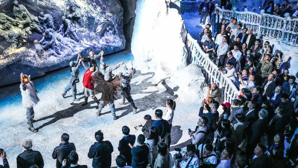2023年10月22日,觀眾在位于貴陽市的“紅飄帶”數(shù)字體驗館內(nèi)觀看體驗長征故事。以長征為主題的數(shù)字體驗館——“紅飄帶”項目利用全息影像、三維聲場等新技術(shù)再現(xiàn)偉大長征。新華社記者 陶亮 攝