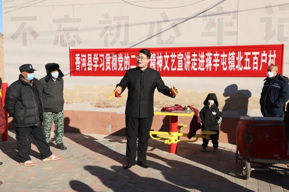 河北省香河縣文化館的文藝工作者張鑫銘在香河縣蔣辛屯鎮(zhèn)北五百戶村進(jìn)行黨的二十大精神“快板宣講”(2022年12月13日攝)。新華社發(fā)