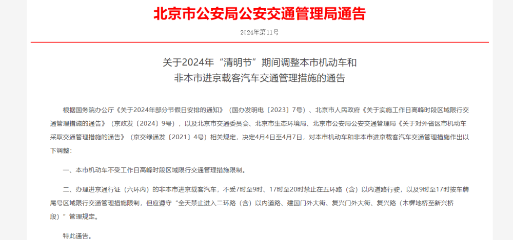 根據(jù)國務(wù)院辦公廳《關(guān)于2024年部分節(jié)假日安排的通知》(國辦發(fā)明電〔2023〕7號(hào))、北京市人民政府《關(guān)于實(shí)施工作日高峰時(shí)段區(qū)域限行交通管理措施的通告》(京政發(fā)〔2024〕9號(hào)),以及北京市交通委員會(huì)、北京市生態(tài)環(huán)境局、北京市公安局公安交通管理局《關(guān)于對(duì)外省區(qū)市機(jī)動(dòng)車采取交通管理措施的通告》(京交綠通發(fā)〔2021〕4號(hào))相關(guān)規(guī)定,決定4月4日至4月7日,對(duì)本市機(jī)動(dòng)車和非本市進(jìn)京載客汽車交通管理措施作出以下調(diào)整: