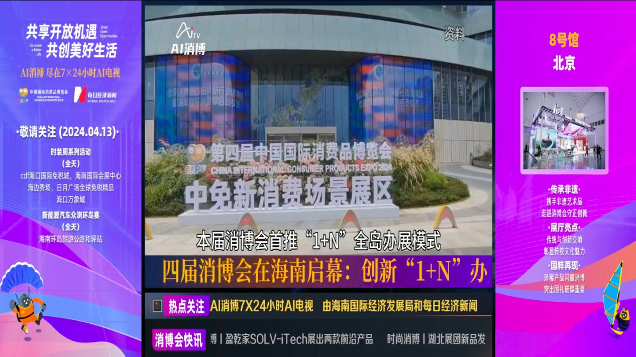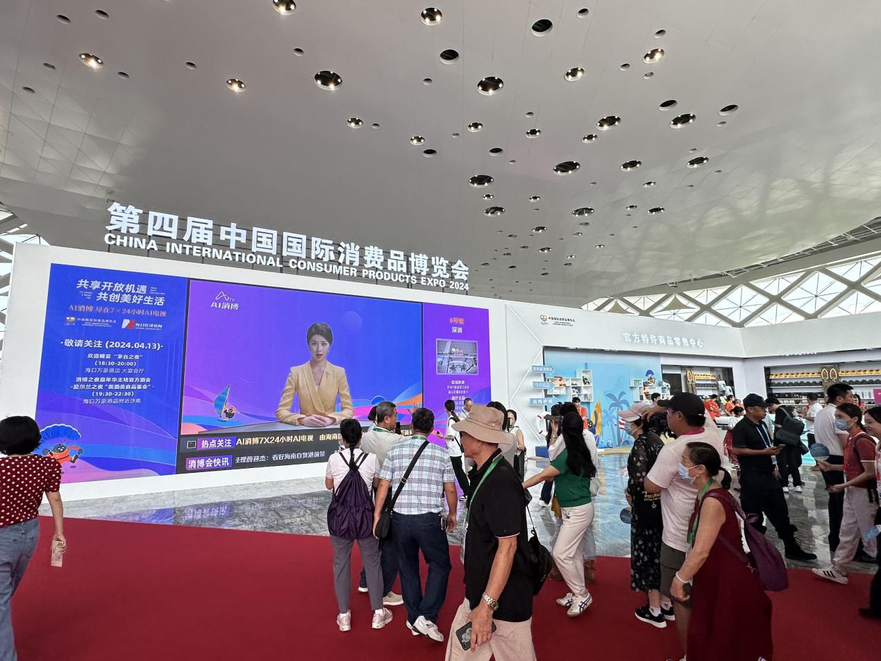 與往屆不同,第四屆消博會把握全球科技發(fā)展大勢,在國際傳播方面創(chuàng)新探索了打造“AI消博”的新方式,即:通過全方位、全流程、全周期的AI技術,實時生產文字稿件和視頻內容,進行全網分發(fā),并運用AI電視進行線上線下同步直播。