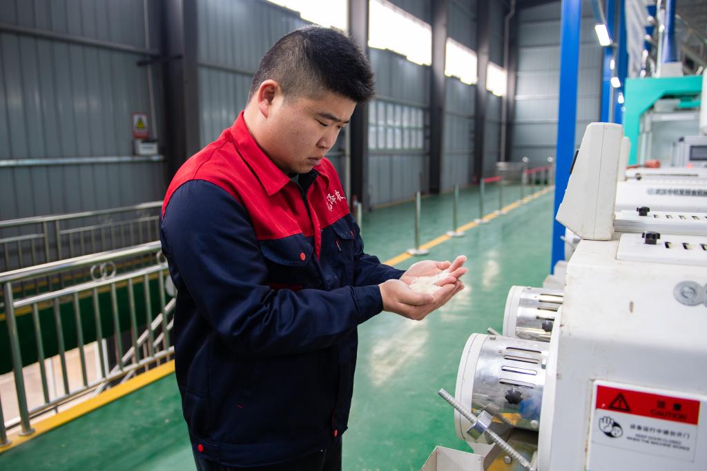 2022年2月22日,在湖南省常德市鼎城區(qū)謝家鋪鎮(zhèn)億澤生態(tài)農(nóng)業(yè)科技有限公司生產(chǎn)車間,陳帥宇在抽查生產(chǎn)過程中大米的品質(zhì)。新華社記者 周勉 攝