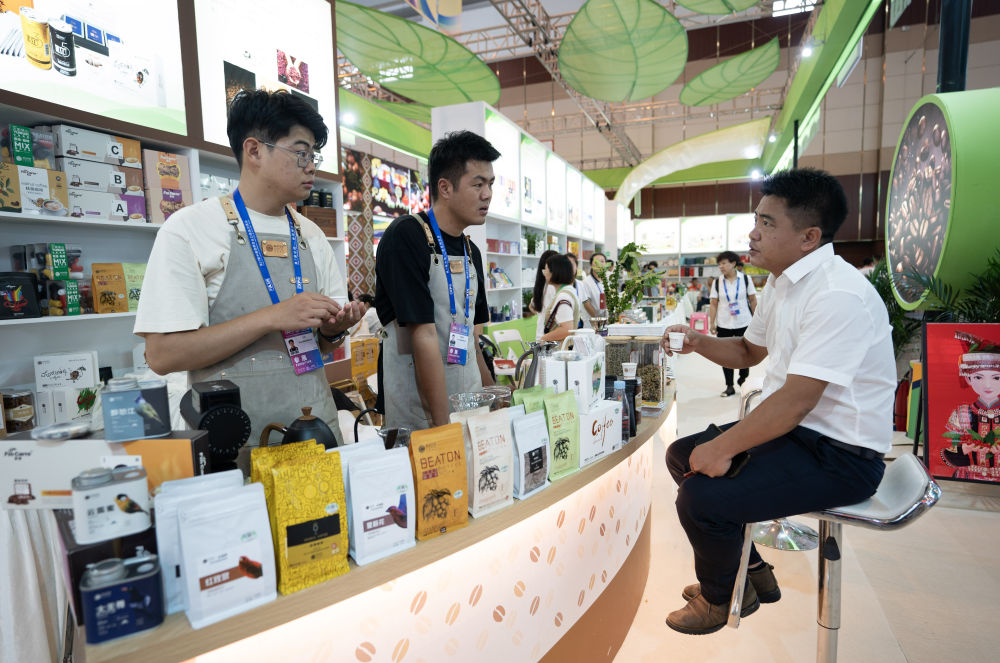來自云南保山的參展商在第七屆中國—南亞博覽會(huì)上向參觀者介紹咖啡產(chǎn)品(2023年8月16日攝)。新華社記者 陳欣波 攝