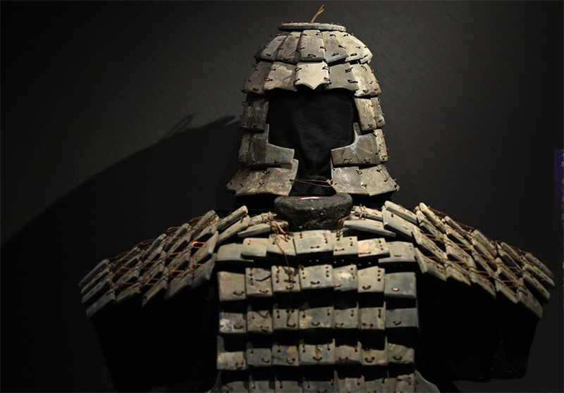 陜西歷史博物館秦漢館內(nèi)展出的石鎧甲及石胄(2024年5月6日攝)。新華社記者 李一博 攝