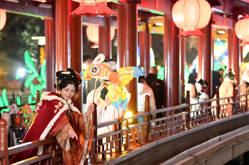 2024年2月2日,游客在西安大唐芙蓉園觀看長安燈會。新華社記者 李一博 攝