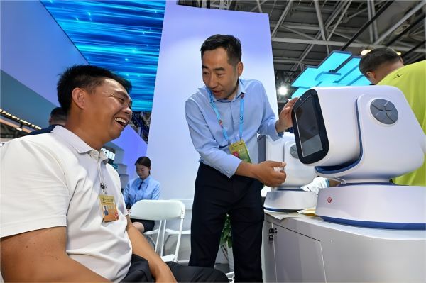 數(shù)字山東館內(nèi),觀眾在體驗(yàn)家庭健康管理機(jī)器人