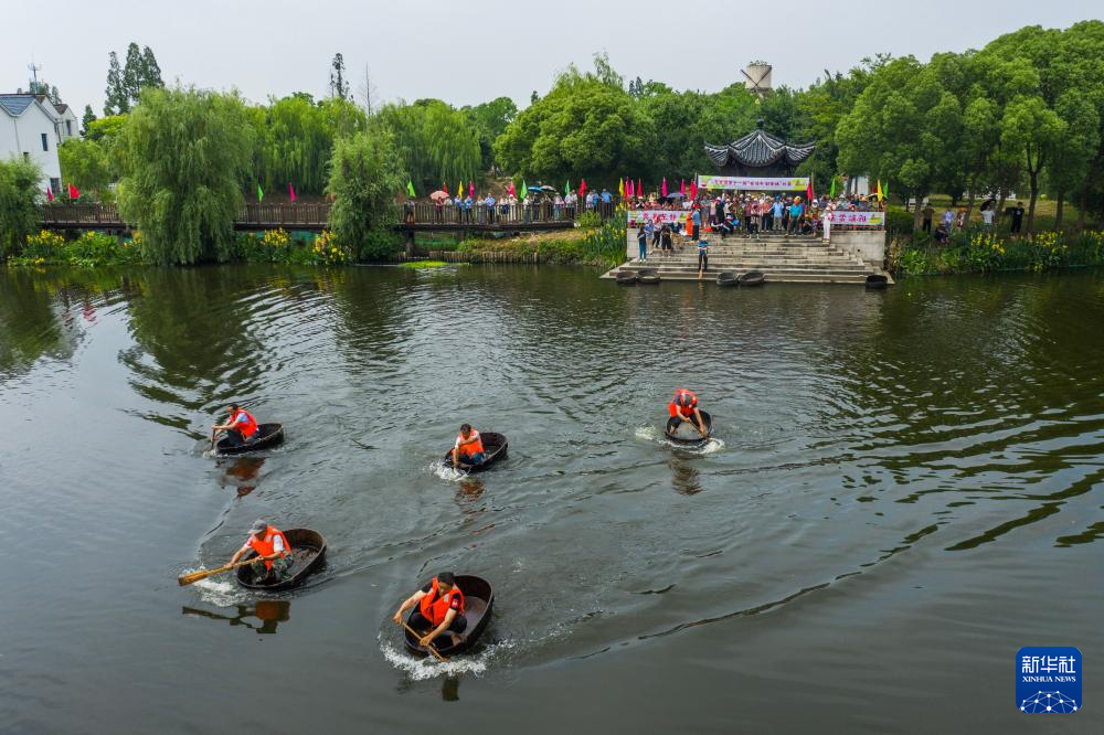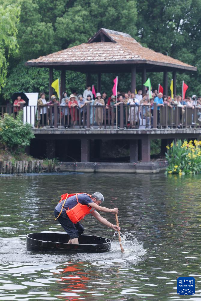 當(dāng)日,浙江省湖州市吳興區(qū)東林鎮(zhèn)舉辦“慶端午 劃菱桶”水鄉(xiāng)端午趣味民俗活動(dòng),來自東林鎮(zhèn)各村的村民們?cè)谌娲鍏⒓恿怂l(xiāng)劃菱桶比賽、荷塘釣小龍蝦、做艾草花束、包粽子等端午趣味民俗活動(dòng),在初夏時(shí)節(jié)呈現(xiàn)江南水鄉(xiāng)特有的迎端午氣氛。