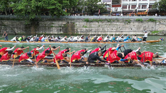 河面上船槳舞動、水花四濺,一艘艘龍舟競速沖刺。這是今年端午節(jié)期間,貴州省鎮(zhèn)遠縣舉行的賽龍舟活動上的一幕。