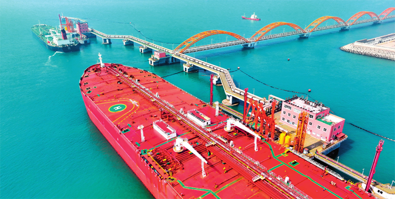 在山東港口日照港嵐山港區(qū)30 萬(wàn)噸級(jí)油品碼頭,船舶??窟M(jìn)行卸油作業(yè)(2024年3月29日攝)郭緒雷攝 / 本刊