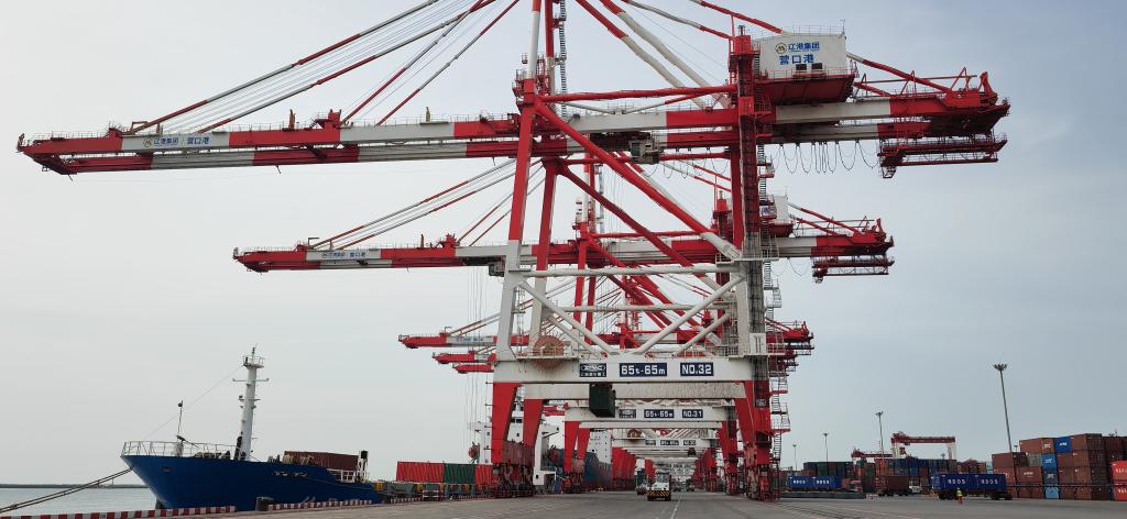 藍(lán)天碧海,波光粼粼。遼東灣畔的營口港集裝箱碼頭一派繁忙景象。巨型門式起重機(jī)將一個(gè)個(gè)集裝箱“抓”起,平穩(wěn)移至??吭诖a頭邊的貨輪上。堆場上,數(shù)量眾多的待發(fā)集裝箱整齊擺放,即將裝船出海。