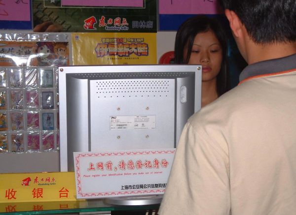 圖為2002年,《互聯(lián)網(wǎng)上網(wǎng)服務(wù)營(yíng)業(yè)場(chǎng)所管理?xiàng)l例》施行,上海某網(wǎng)吧柜臺(tái)上寫(xiě)著“上網(wǎng)前,請(qǐng)您登記身份”。(視覺(jué)中國(guó))