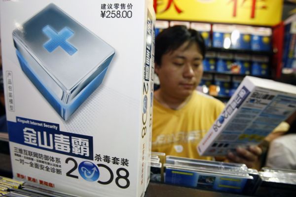 圖為2008年8月16日,某正版軟件商店內(nèi),顧客在選購(gòu)國(guó)產(chǎn)正版殺毒軟件。 (視覺(jué)中國(guó))