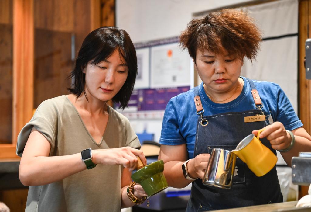 6月20日,土錘咖啡主理人王繪婷(左)與服務(wù)員在店內(nèi)制作咖啡。新華社記者 蔡湘鑫 攝