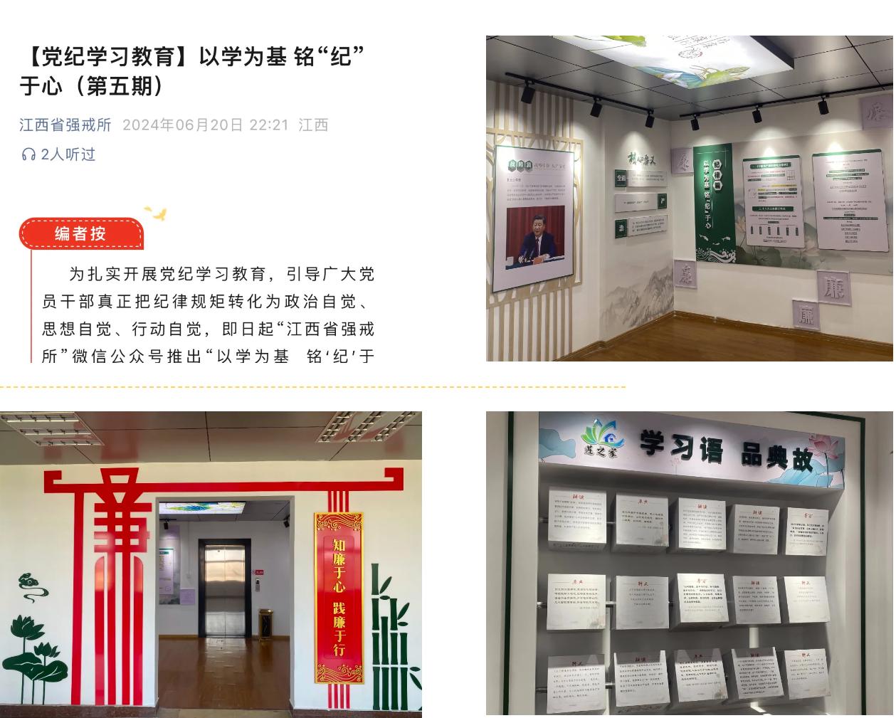 江西省強(qiáng)戒所把開展黨紀(jì)學(xué)習(xí)教育作為重要政治任務(wù),緊盯學(xué)習(xí)重點(diǎn),拓展學(xué)習(xí)形式,注重學(xué)用結(jié)合。依托所微信公眾號、所內(nèi)網(wǎng)、LED顯示屏等媒介推送黨紀(jì)知識,開設(shè)“以學(xué)為基 銘‘紀(jì)’于心”、黨紀(jì)學(xué)習(xí)教育專欄等;綜合運(yùn)用圖文、音頻、視頻等形式,通過講、寫、學(xué)、測等方式展現(xiàn)學(xué)習(xí)教育成效,構(gòu)建全方位宣傳矩陣,營造全員參與、人人學(xué)紀(jì)的濃厚氛圍。