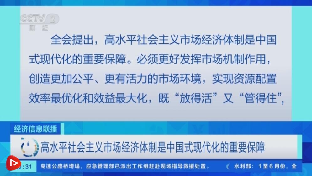 央視網(wǎng)消息:《中國共產(chǎn)黨第二十屆中央委員會第三次全體會議公報》指出,到二〇三五年,全面建成高水平社會主義市場經(jīng)濟體制。全會對進一步全面深化改革做出系統(tǒng)部署,強調(diào)構(gòu)建高水平社會主義市場經(jīng)濟體制,而高水平意味著社會主義市場經(jīng)濟體制更加系統(tǒng)完備和成熟定型。