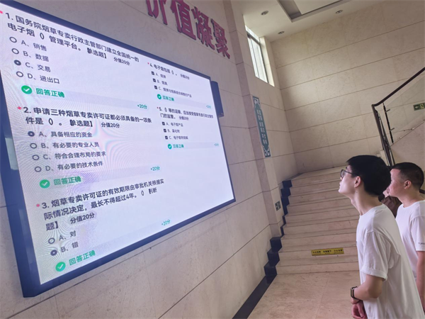 利用線上線下同時推進(jìn),形成合力,強(qiáng)化協(xié)調(diào)配合。線上,通過微信群督促打卡,確保全體干部職工按時保質(zhì)答題;線下,利用LED顯示屏滾動播放煙草法律法規(guī)宣傳海報,營造全員學(xué)習(xí)的濃厚氛圍。
