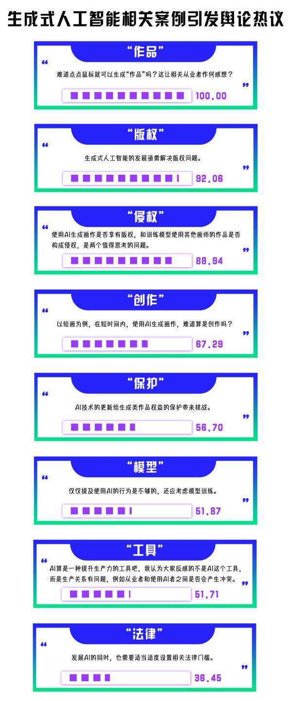 與生成式人工智能有關(guān)的案件一經(jīng)宣判,便引發(fā)了輿論廣泛關(guān)注,“作品”“版權(quán)”“模型”“工具”“法律”等詞語頻繁被提及,成為公眾討論的焦點(diǎn)。