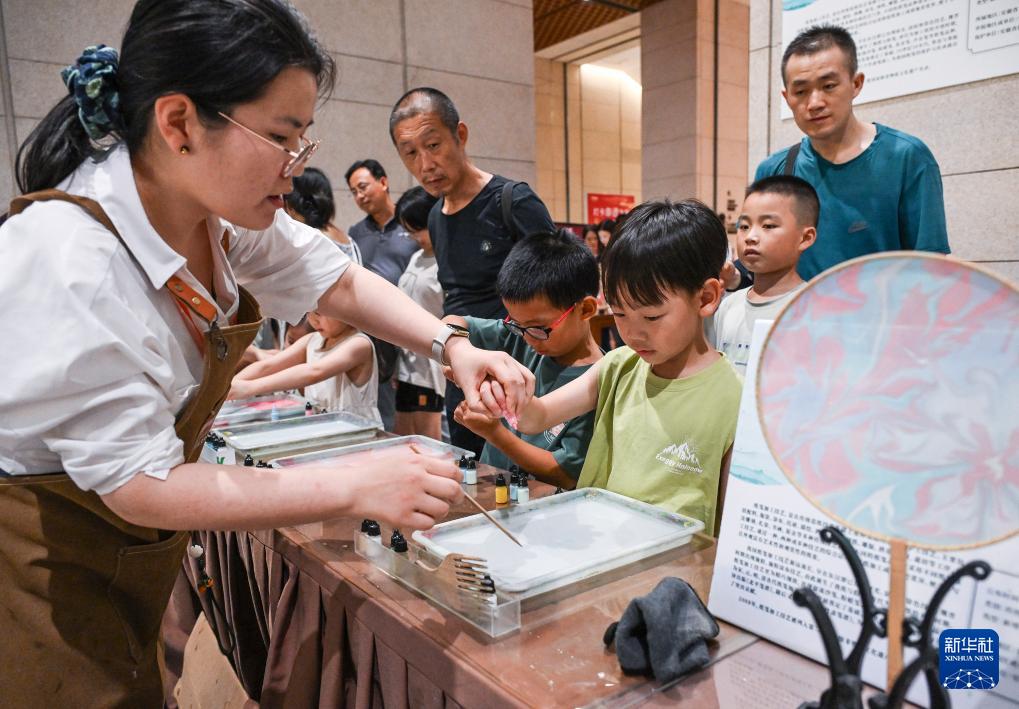 8月7日,在非遺體驗(yàn)區(qū),小朋友在工作人員指導(dǎo)下體驗(yàn)紙箋加工技藝。