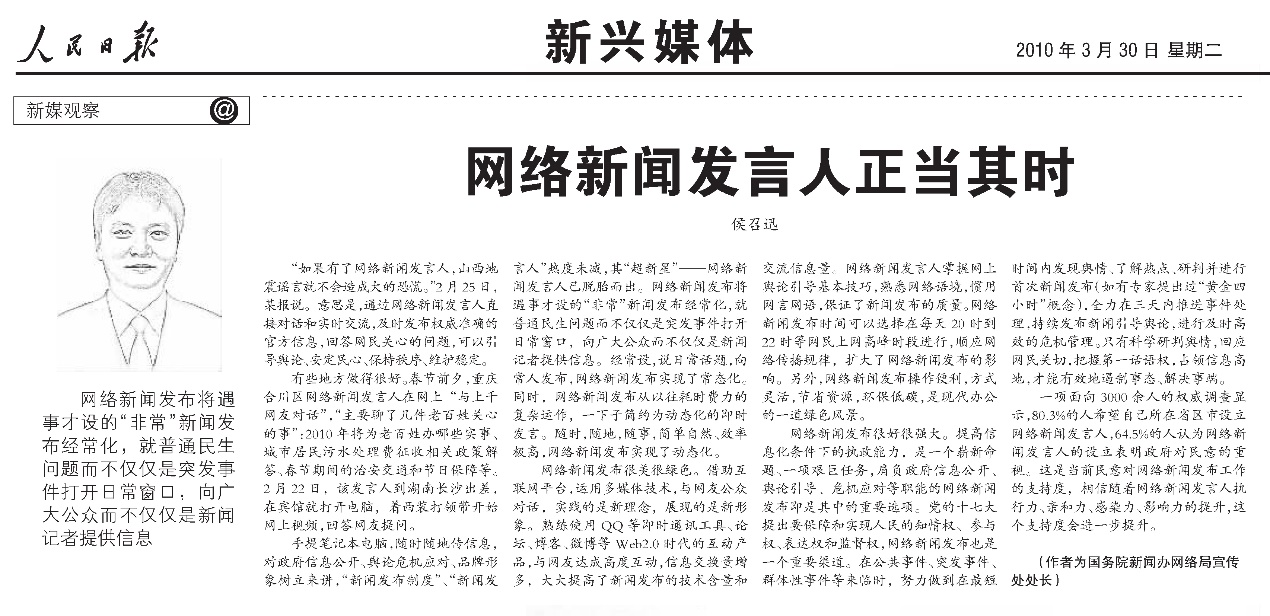2010年3月30日,《人民日報(bào)》刊發(fā)《網(wǎng)絡(luò)新聞發(fā)言人正當(dāng)其時(shí)》。