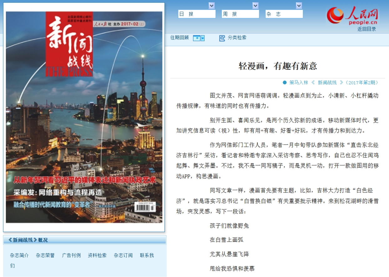 人民日報(bào)社《新聞戰(zhàn)線》雜志2017年第2期刊發(fā)《輕漫畫,有趣有新意》。