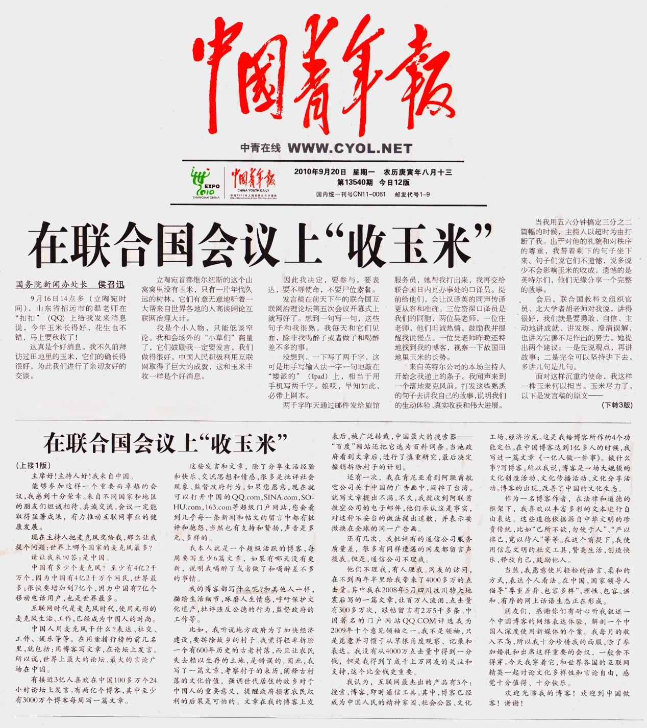 2010年9月20日,《中國青年報(bào)》一版刊發(fā)《在聯(lián)合國會議上“收玉米”》。