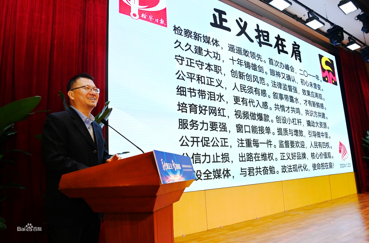 2024年1月23日,參加檢察新媒體創(chuàng)新發(fā)展研討會暨2023年度全國檢察新媒體精品展示活動,發(fā)言提出:我從2013年至今參加過6屆檢察日報(bào)社新媒體活動,是資深粉絲,有深厚感情。檢察日報(bào)社團(tuán)結(jié)檢察機(jī)關(guān)新媒體同仁秉承“強(qiáng)化法律監(jiān)督維護(hù)公平正義”宗旨,久久為功,十年鑄劍,成功打造了“正義”新媒體融媒體品牌,令人備感振奮、備受鼓舞。在新時(shí)代新征程上,希望“正義”新媒體融媒體守正創(chuàng)新,注重共情共鳴,集結(jié)社會力量,通過短視頻等新傳播方式,充分呈現(xiàn)法律監(jiān)督效果,講好政法故事,增強(qiáng)傳播力服務(wù)力監(jiān)督力公信力,讓人民群眾在每一個(gè)司法案件中感受到公平正義?!墩x擔(dān)在肩》:檢察新媒體,遙遙敢領(lǐng)先。首次辦峰會,二〇一一年。久久建大功,十年鑄利劍。眼神又確認(rèn),初心未曾變。守正守本職,創(chuàng)新創(chuàng)風(fēng)范。法律監(jiān)督強(qiáng),效果應(yīng)再現(xiàn)。公平和正義,人民須有感。敘事帶露水,才有新鮮感。細(xì)節(jié)帶淚水,更有代入感。共情才共鳴,共識方共建。培育好網(wǎng)紅,視頻做爆款。創(chuàng)設(shè)小杠桿,撬動大資源。服務(wù)力要強(qiáng),窗口能接單。提質(zhì)與增效,引導(dǎo)做中堅(jiān)。公開促公正,注重每一件。監(jiān)督要?dú)g迎,人民有四權(quán)。公信力止損,出路在維權(quán)。正義好品牌,核心價(jià)值觀。建設(shè)全媒體,與君共奮勉。政法現(xiàn)代化,使命擔(dān)在肩。