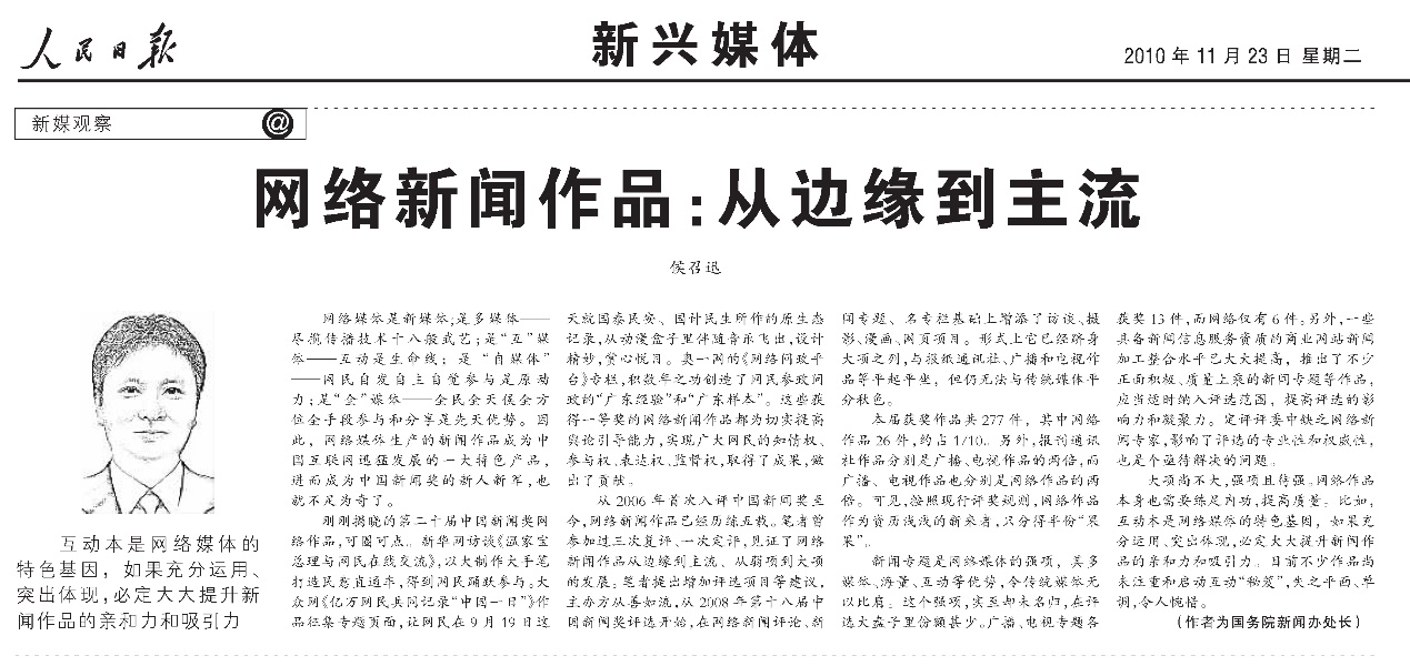 2010年11月23日,《人民日報(bào)》刊發(fā)《網(wǎng)絡(luò)新聞作品:從邊緣到主流》。
