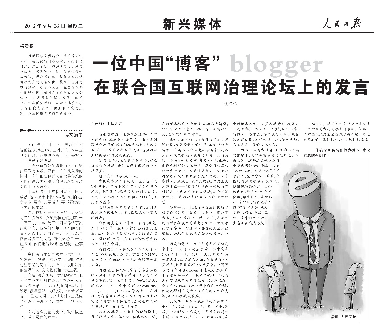2010年9月28日,《人民日報(bào)》刊發(fā)《一位中國博客在聯(lián)合國互聯(lián)網(wǎng)治理論壇上的發(fā)言》。