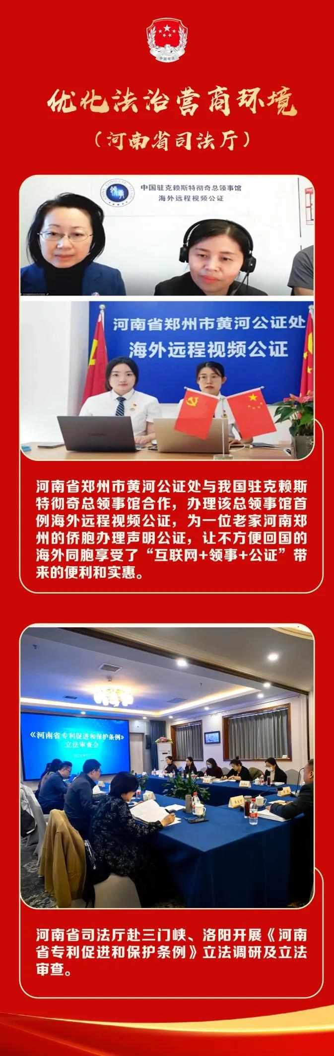 去年以來,我們聚焦發(fā)展新質生產(chǎn)力、推進中部地區(qū)崛起等中心工作,圍繞河南省委、省政府提出的錨定“兩個確保”、持續(xù)實施“十大戰(zhàn)略”、推進“十大建設”工作部署,不斷優(yōu)化法治化營商環(huán)境,采取了一系列務實舉措:聚焦提升領導干部法治意識法治思維、提高依法行政能力水平,出臺《關于進一步加強全面依法治省工作的意見》《河南省領導干部應知應會黨內(nèi)法規(guī)和國家法律清單》。牽頭制定《河南省營商環(huán)境綜合配套改革法治化專項方案》,部署立法、執(zhí)法、司法、法律服務、政務誠信、政務服務“六大行動”,明確25項具體任務。推動出臺《中國(河南)自由貿(mào)易試驗區(qū)條例》《鄭州航空港經(jīng)濟綜合實驗區(qū)條例》,為試(實)驗區(qū)賦權、松綁,激發(fā)各方主體發(fā)展活力;出臺《河南省保障稅收服務發(fā)展條例》《河南省專精特新企業(yè)培育支持辦法》和省司法廳服務保障民營經(jīng)濟發(fā)展10項措施,為中央和河南重大戰(zhàn)略實施提供法治保障。