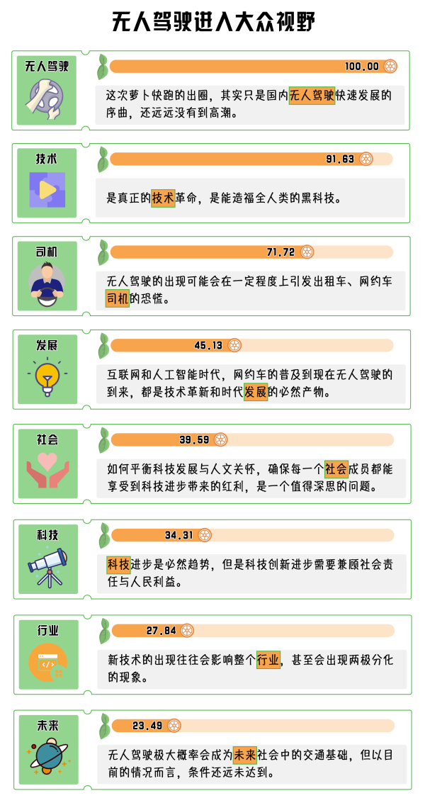 “蘿卜快跑”助推無(wú)人駕駛熱度上升,輿論對(duì)此褒貶不一。綜合輿論來(lái)看,有網(wǎng)民認(rèn)為,無(wú)人駕駛的普及會(huì)在一定程度上對(duì)網(wǎng)約車(chē)、出租車(chē)等造成沖擊,屆時(shí)行業(yè)可能面臨重構(gòu),就業(yè)問(wèn)題便會(huì)浮現(xiàn);也有網(wǎng)民表示,隨著互聯(lián)網(wǎng)和人工智能的發(fā)展,科技進(jìn)步是必然現(xiàn)象,無(wú)人駕駛作為一項(xiàng)新技術(shù),其存在的價(jià)值是造福社會(huì),不應(yīng)有對(duì)錯(cuò)之分;還有網(wǎng)民大膽預(yù)測(cè),此次“蘿卜快跑”的爆火,只是釋放無(wú)人駕駛發(fā)展的信號(hào),無(wú)人駕駛還遠(yuǎn)未迎來(lái)高潮;也有網(wǎng)民指出,科技進(jìn)步是必然趨勢(shì),但人文關(guān)懷必不可少,科技創(chuàng)新如何兼顧社會(huì)責(zé)任、造福大眾,是一個(gè)值得深思的問(wèn)題。