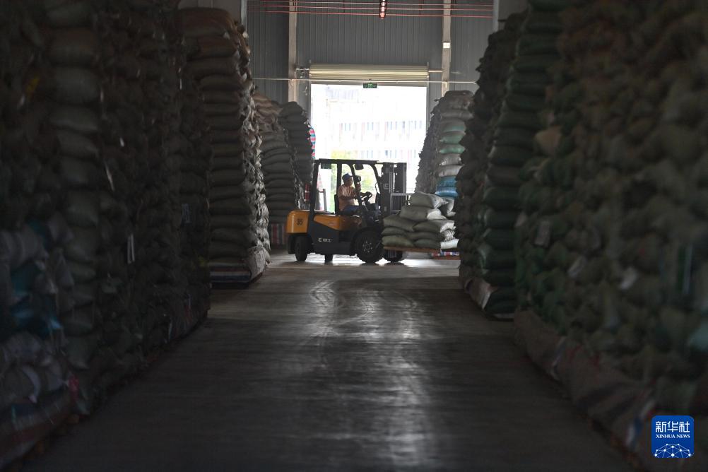 在廣西仙草堂制藥有限責任公司,工人在搬運青蒿原料(8月27日攝)。