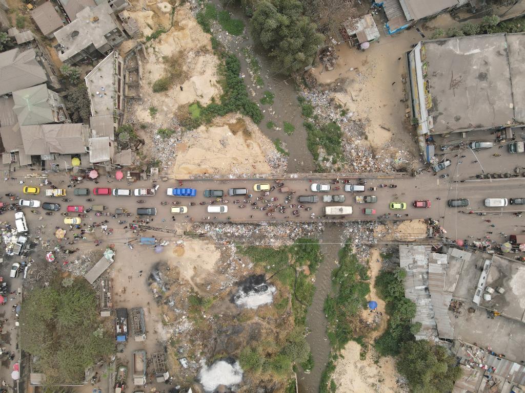 8月17日,在剛果(金)首都金沙薩郊區(qū)的金蘇卡大橋上,通行車(chē)輛在橋上駛過(guò)。(無(wú)人機(jī)照片)