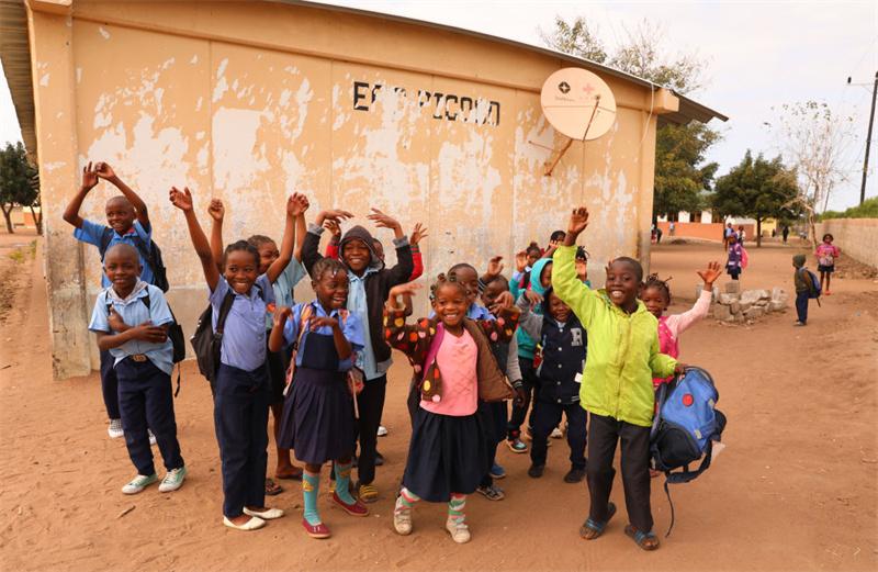 2023年7月25日,莫桑比克馬普托省皮科科村學(xué)校的孩子們站在裝有中國援助的衛(wèi)星電視接收天線的房屋前?!叭f村通”項(xiàng)目旨在為非洲國家的1萬個(gè)村莊接入衛(wèi)星數(shù)字電視信號(hào),項(xiàng)目2018年在莫桑比克啟動(dòng),為該國1000個(gè)村落、2萬戶家庭和3000個(gè)公共場(chǎng)所安裝衛(wèi)星電視設(shè)備,提供電視信號(hào)和節(jié)目,覆蓋農(nóng)村人口達(dá)250萬。新華社記者 董江輝 攝