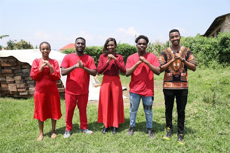 2024年2月7日,在盧旺達(dá)南方省卡莫尼地區(qū),盧旺達(dá)青年團(tuán)隊(duì)成員向鏡頭前觀眾送上新春祝福。新華社發(fā)(黃萬晴 攝)