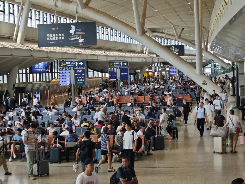 9月13日,旅客們?cè)谖錆h站候車(chē)室候車(chē)。(楊澤宇 攝)