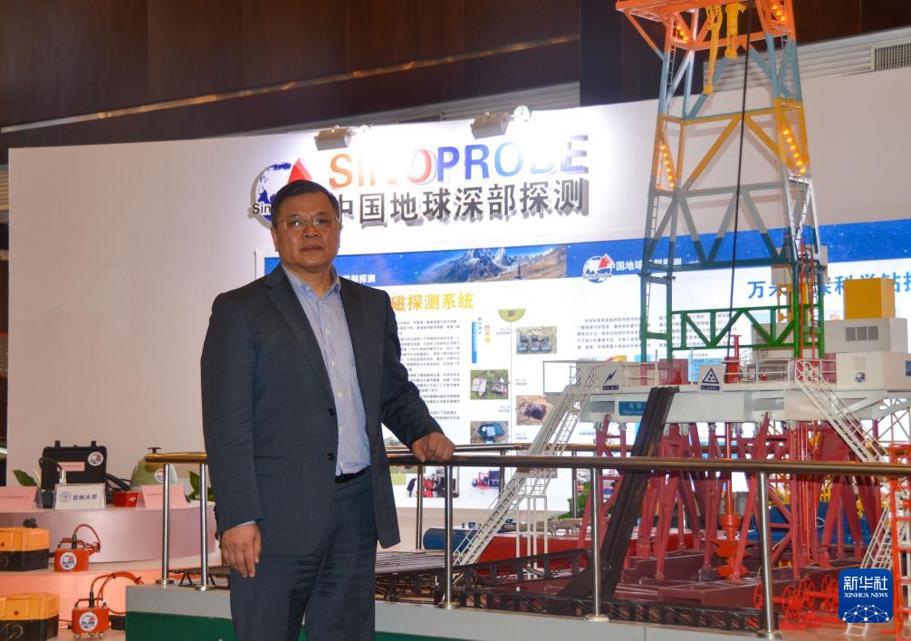 黃大年在中國地球深部探測(cè)項(xiàng)目年會(huì)上(2013年4月18日攝),身旁是他率領(lǐng)團(tuán)隊(duì)研發(fā)的“地殼一號(hào)”萬米大陸科學(xué)鉆探機(jī)的展示模型。 新華社發(fā)