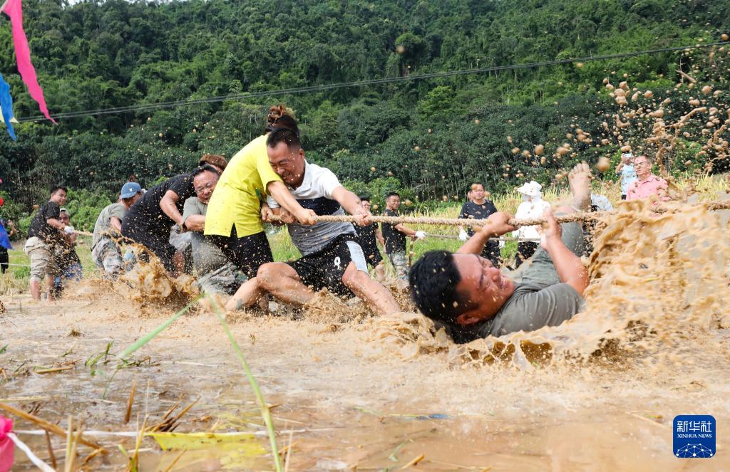 9月28日,云南省勐臘縣關(guān)累鎮(zhèn)曼丟村的村民在該村的迎國慶水田拔河比賽中奮勇拼搏。