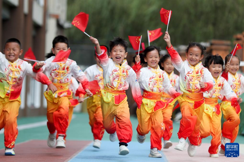9月27日,在貴州省開陽縣第二幼兒園舉行的喜迎國慶活動中,小朋友揮舞國旗開心奔跑。