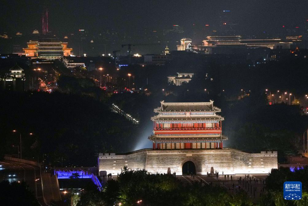9月26日拍攝的完成景觀照明設(shè)施提升后亮燈的永定門(mén)城樓和中軸線上的建筑。