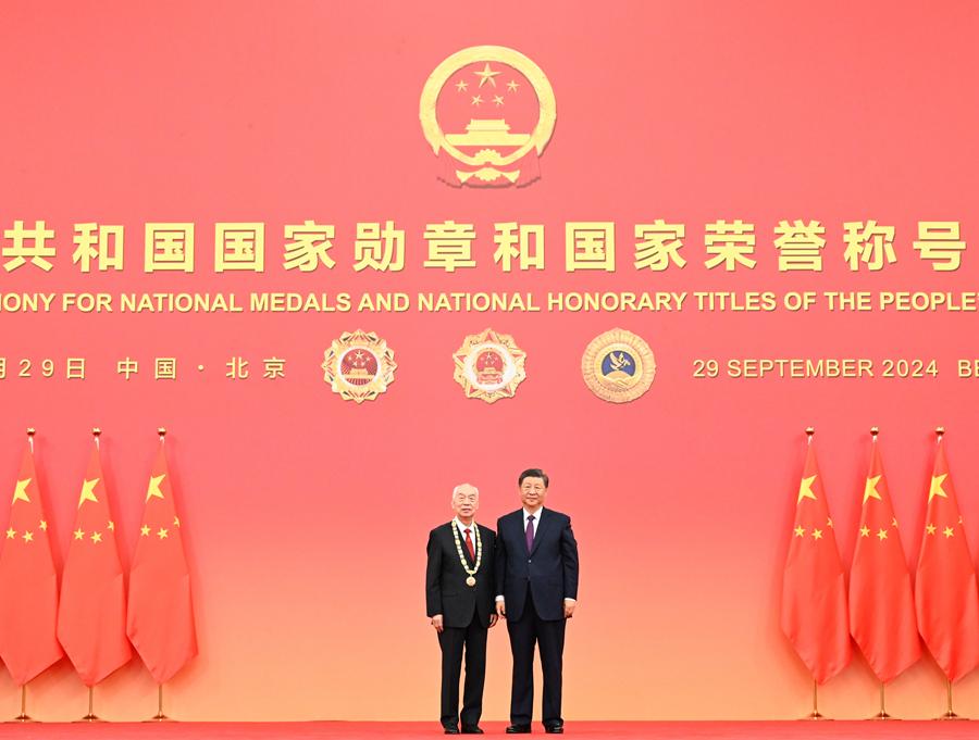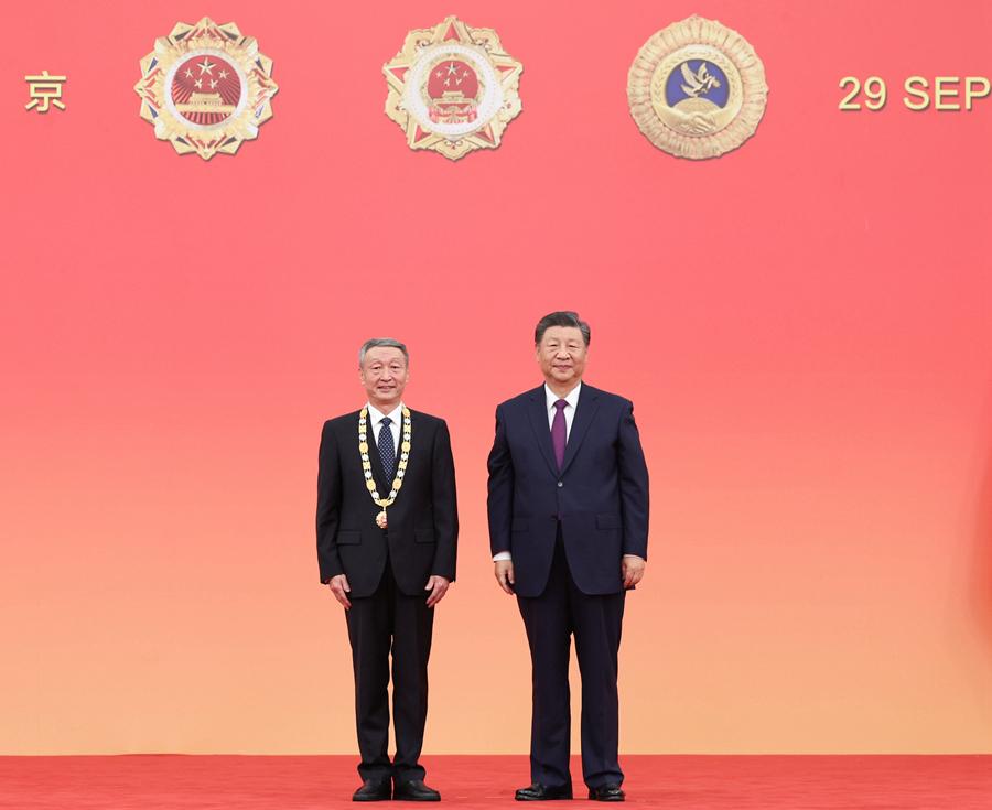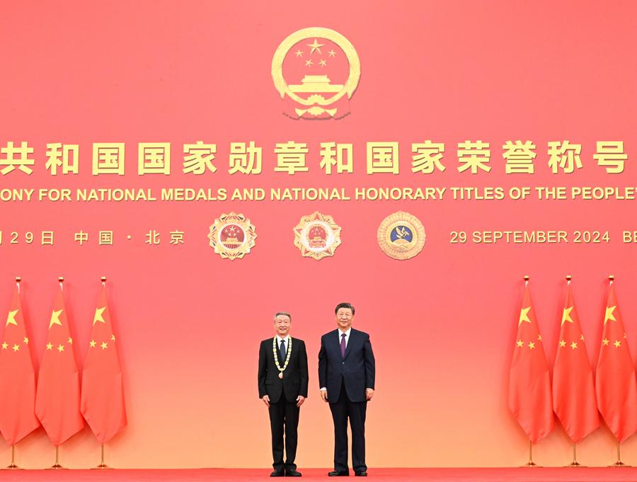 9月29日,中華人民共和國(guó)國(guó)家勛章和國(guó)家榮譽(yù)稱號(hào)頒授儀式在北京人民大會(huì)堂金色大廳隆重舉行。中共中央總書(shū)記、國(guó)家主席、中央軍委主席習(xí)近平向國(guó)家勛章和國(guó)家榮譽(yù)稱號(hào)獲得者頒授勛章獎(jiǎng)?wù)虏l(fā)表重要講話。