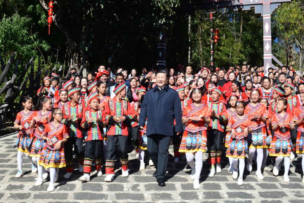2020年1月19日至21日,習近平總書記來到云南,看望慰問各族干部群眾,向全國人民致以新春祝福。這是19日下午,騰沖市清水鄉(xiāng)三家村中寨司莫拉佤族村的鄉(xiāng)親們唱著《阿佤人民唱新歌》,簇擁著習近平總書記走出村口。新華社記者 謝環(huán)馳 攝