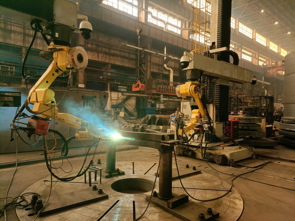 在哈電集團哈爾濱電機廠有限責任公司冷作分廠,藍色的弧光在焊花飛濺中“狂舞”,冰冷與熾熱交織在一起,自動焊接機器人在巨大的廠房內“忙碌”……