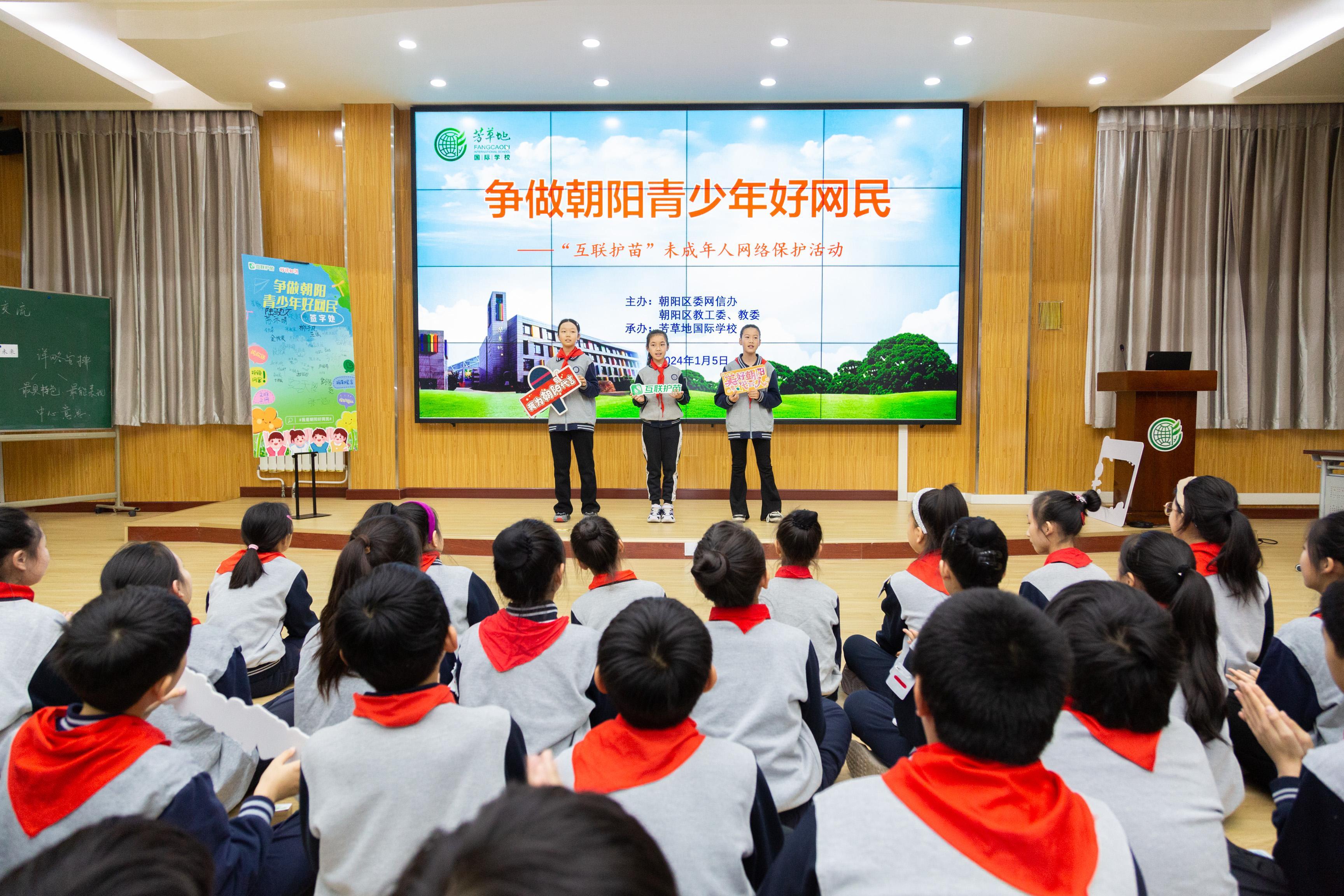 1月5日,北京市朝陽(yáng)區(qū)委網(wǎng)信辦聯(lián)合朝陽(yáng)區(qū)教工委、教委走進(jìn)芳草地國(guó)際學(xué)校舉辦“爭(zhēng)做朝陽(yáng)青少年好網(wǎng)民——‘互聯(lián)護(hù)苗’未成年人網(wǎng)絡(luò)保護(hù)”主題活動(dòng)。