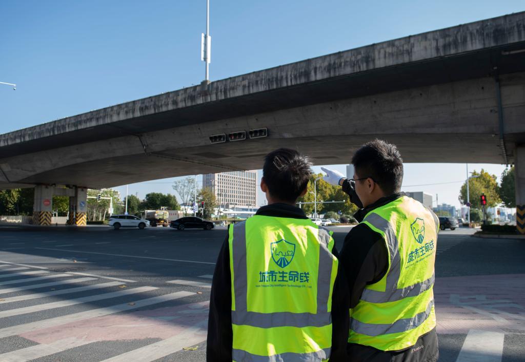 11月7日,工作人員在查看合肥市包河大道紫云路跨線橋監(jiān)測(cè)點(diǎn)位情況。新華社記者 傅天 攝