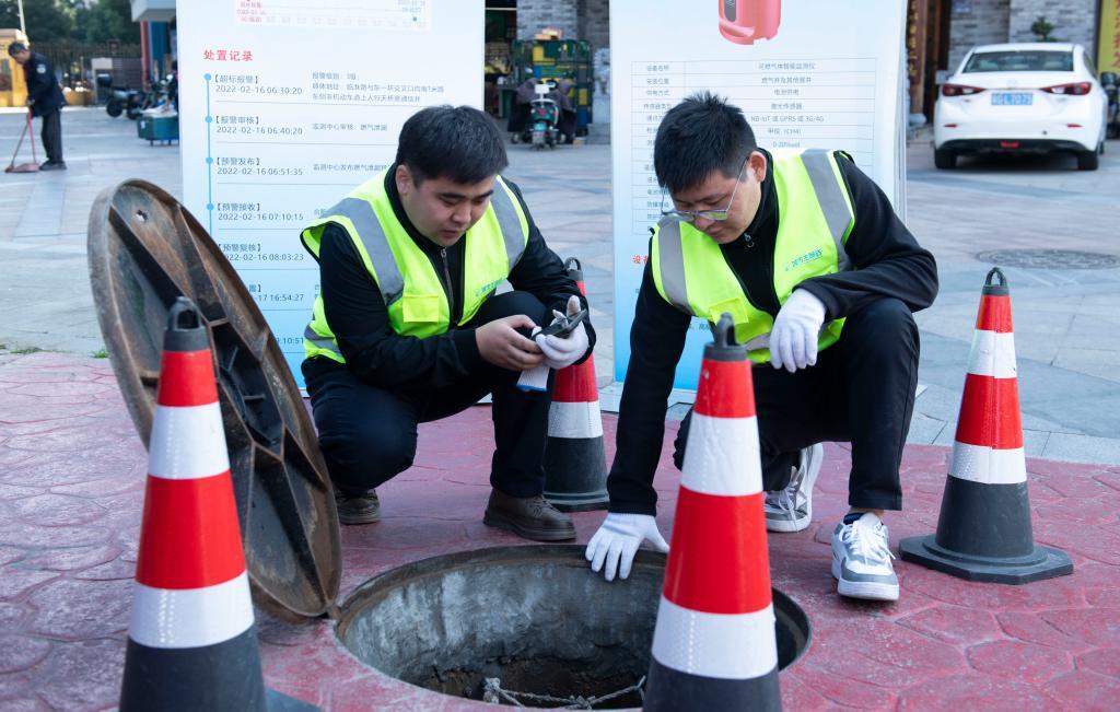 11月7日,運(yùn)維人員在檢查井內(nèi)的可燃?xì)怏w監(jiān)測(cè)儀。新華社記者 傅天 攝