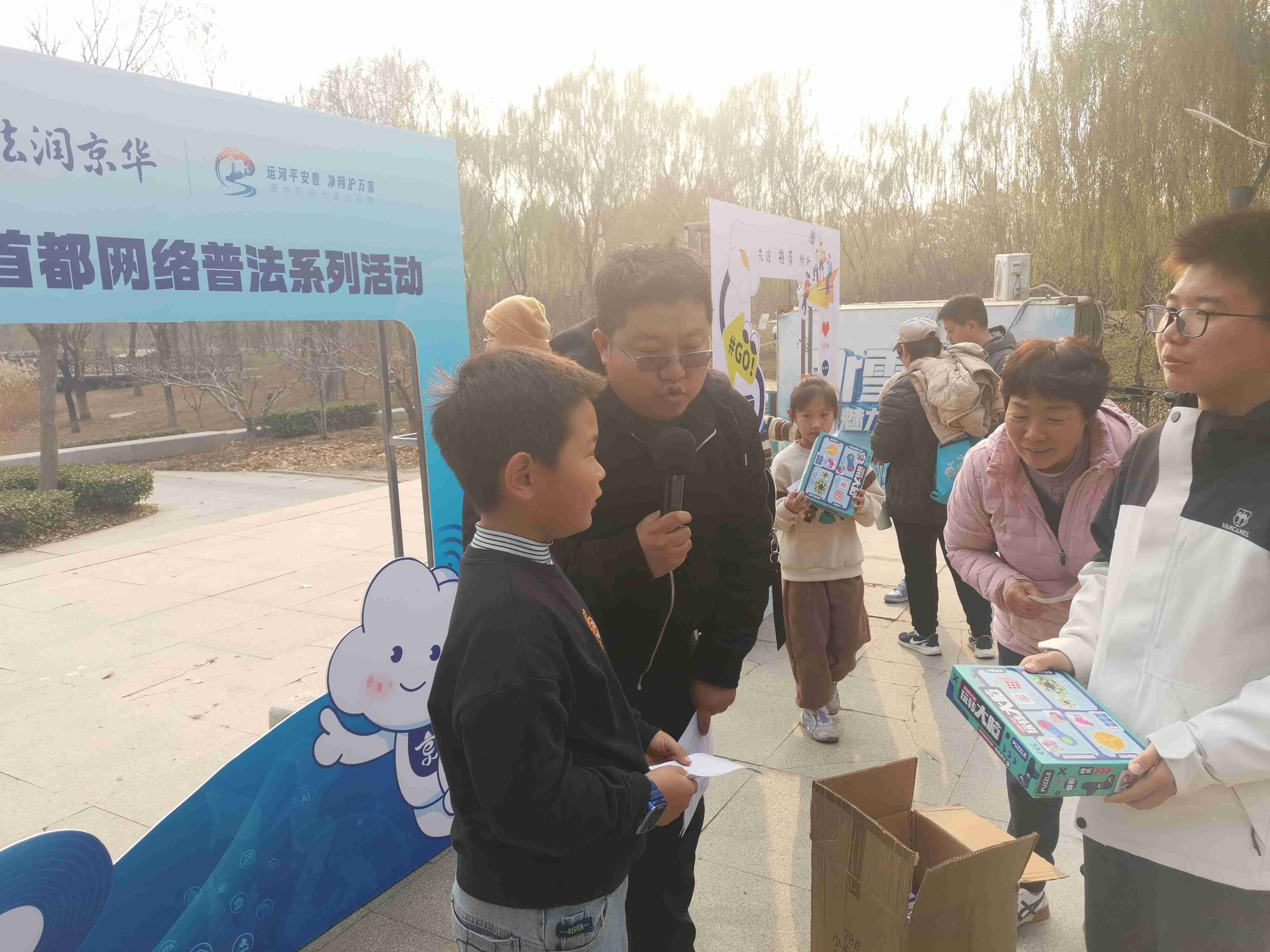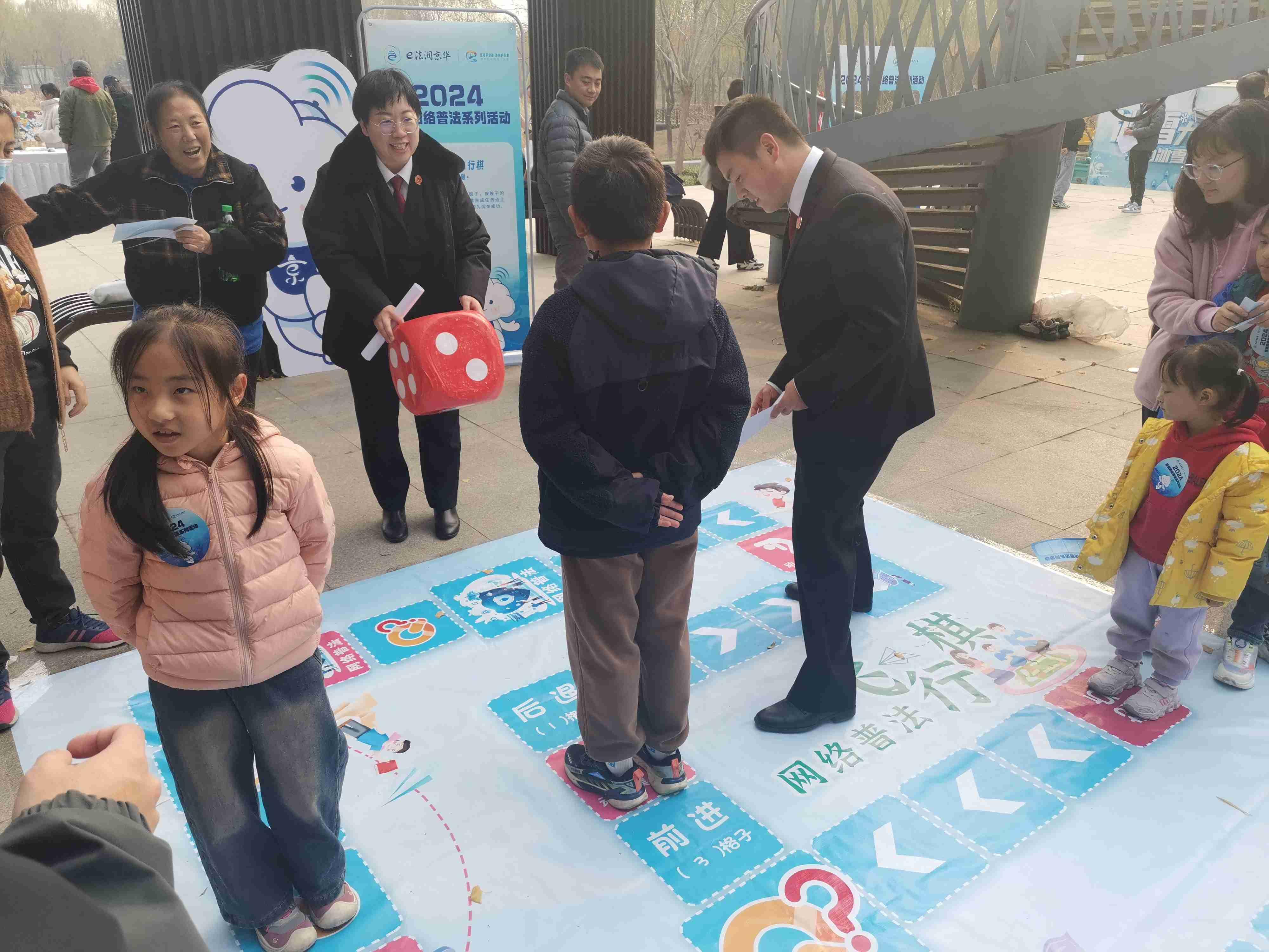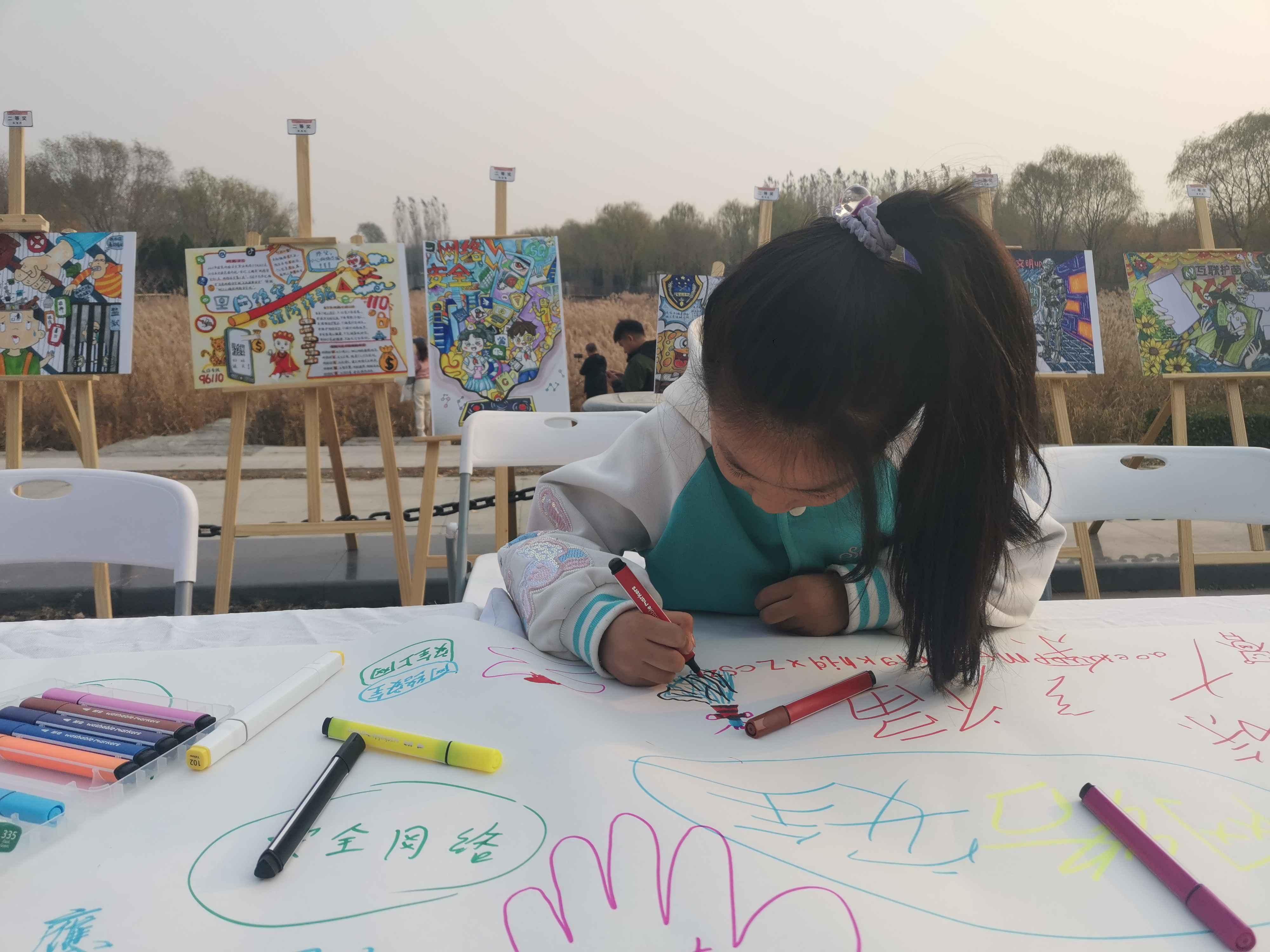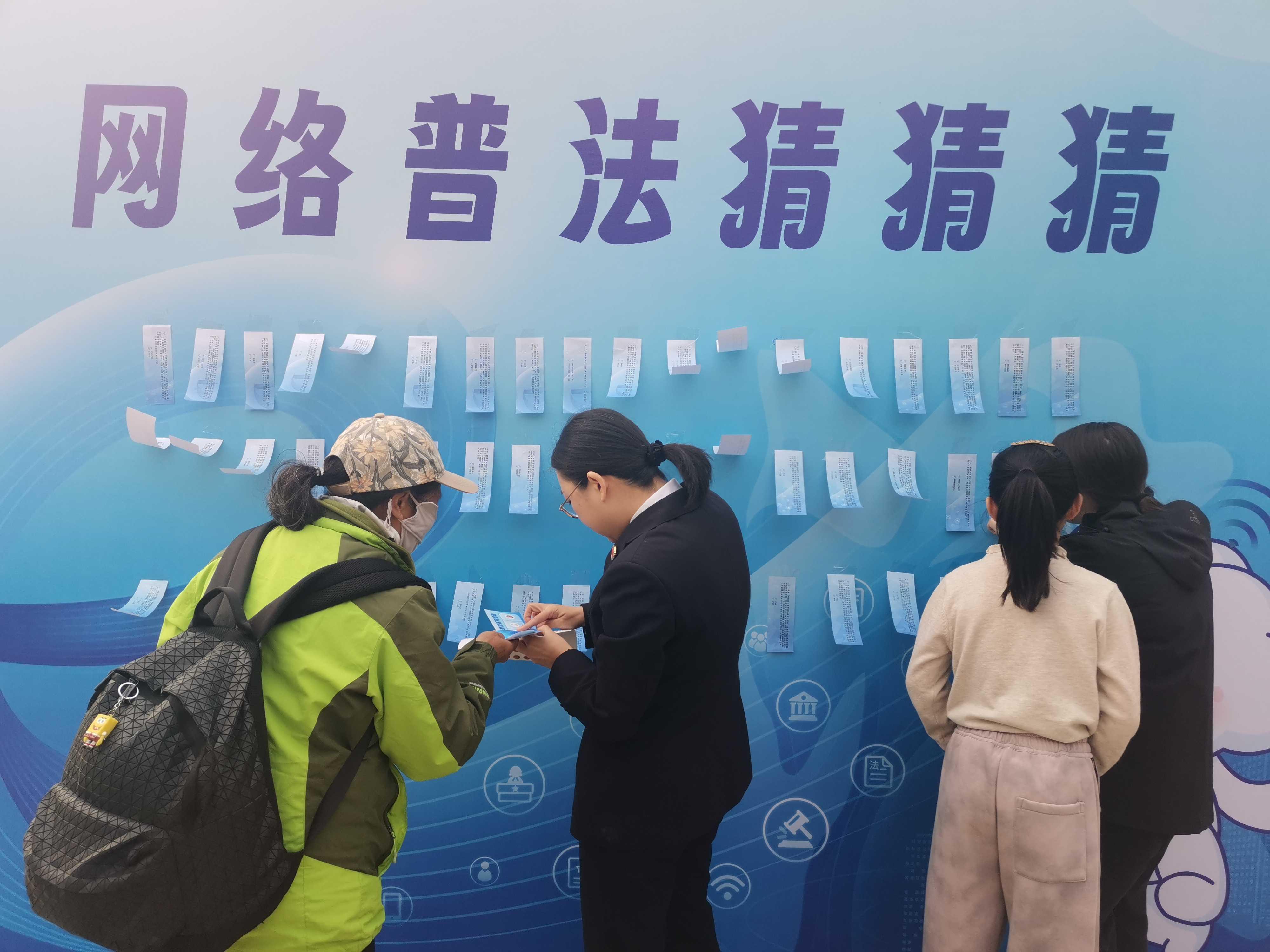 猜謎語(yǔ)、繪圖畫(huà)、拼拼圖、玩游戲……11月9日下午,北京市通州區(qū)臺(tái)湖公園內(nèi)人聲鼎沸、熱鬧非凡,由北京市委網(wǎng)信辦主辦,通州區(qū)委網(wǎng)信辦承辦,通州區(qū)人民法院、通州區(qū)人民檢察院、通州區(qū)教委以及臺(tái)湖鎮(zhèn)人民政府協(xié)辦的“e法潤(rùn)京華·運(yùn)河平安獸 護(hù)網(wǎng)凈萬(wàn)家”網(wǎng)絡(luò)普法游園會(huì)正如火如荼地進(jìn)行。記者在現(xiàn)場(chǎng)看到,人們駐足觀看普法短劇并爭(zhēng)相和劇中的小主人公合影、在普法展板前聽(tīng)檢察官以案講法、在網(wǎng)絡(luò)普法像框墻前打卡留念,在手繪布上畫(huà)下對(duì)網(wǎng)絡(luò)安全和文明上網(wǎng)的理解與期盼。而現(xiàn)場(chǎng)設(shè)置的網(wǎng)絡(luò)普法猜猜猜、普法拼圖大挑戰(zhàn)、網(wǎng)絡(luò)普法飛行棋等闖關(guān)游戲更是引起眾多小朋友的興趣和熱情,每個(gè)游戲區(qū)前都排起了長(zhǎng)隊(duì),在歡聲笑語(yǔ)中,針對(duì)未成年人的網(wǎng)絡(luò)保護(hù)知識(shí)也在孩子們心中扎根發(fā)芽。